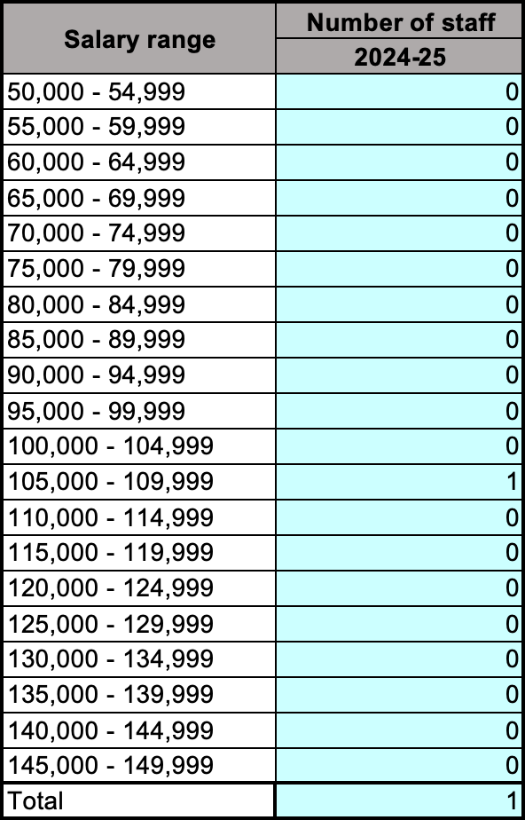 Information about how many school employees (if any) have a gross annual salary of £100,000 or more in increments of £10,000: